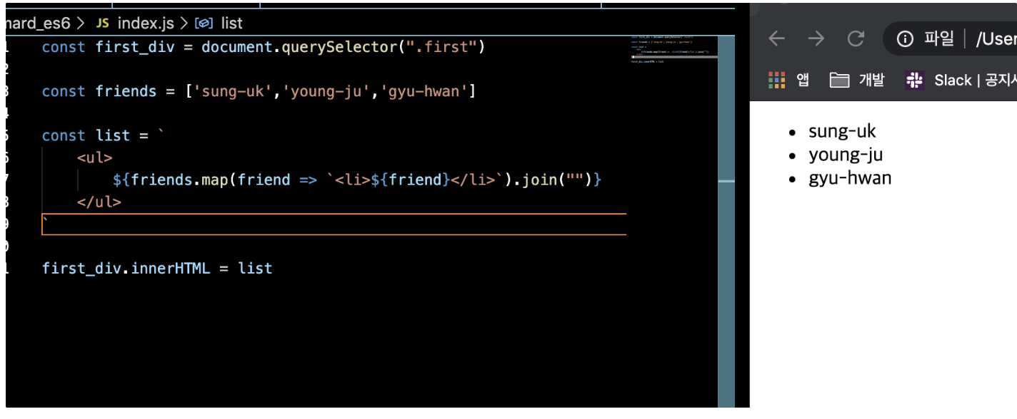 위는 똑같은 동작을 하는 코드이다. es6 이전에는 줄바꿈을 지원하지 않았기 때문에 저렇게 html 형식으로 추가시킬수 없었다. 하지만 이제는 자바스크립트에서 html처럼 코드를 작성한뒤 넣는것이 가능하게 되었다.